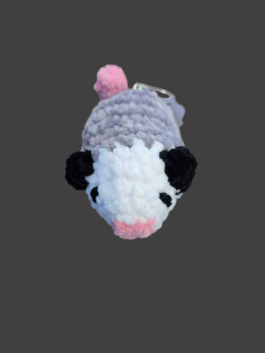Baby possum is quite popular these days! He has a gray body, white head, and black feet and ears with a pink nose and tail. He is make from premier parfait chunky yarn which makes him soft and cuddly. Pattern is by crochet by genna.